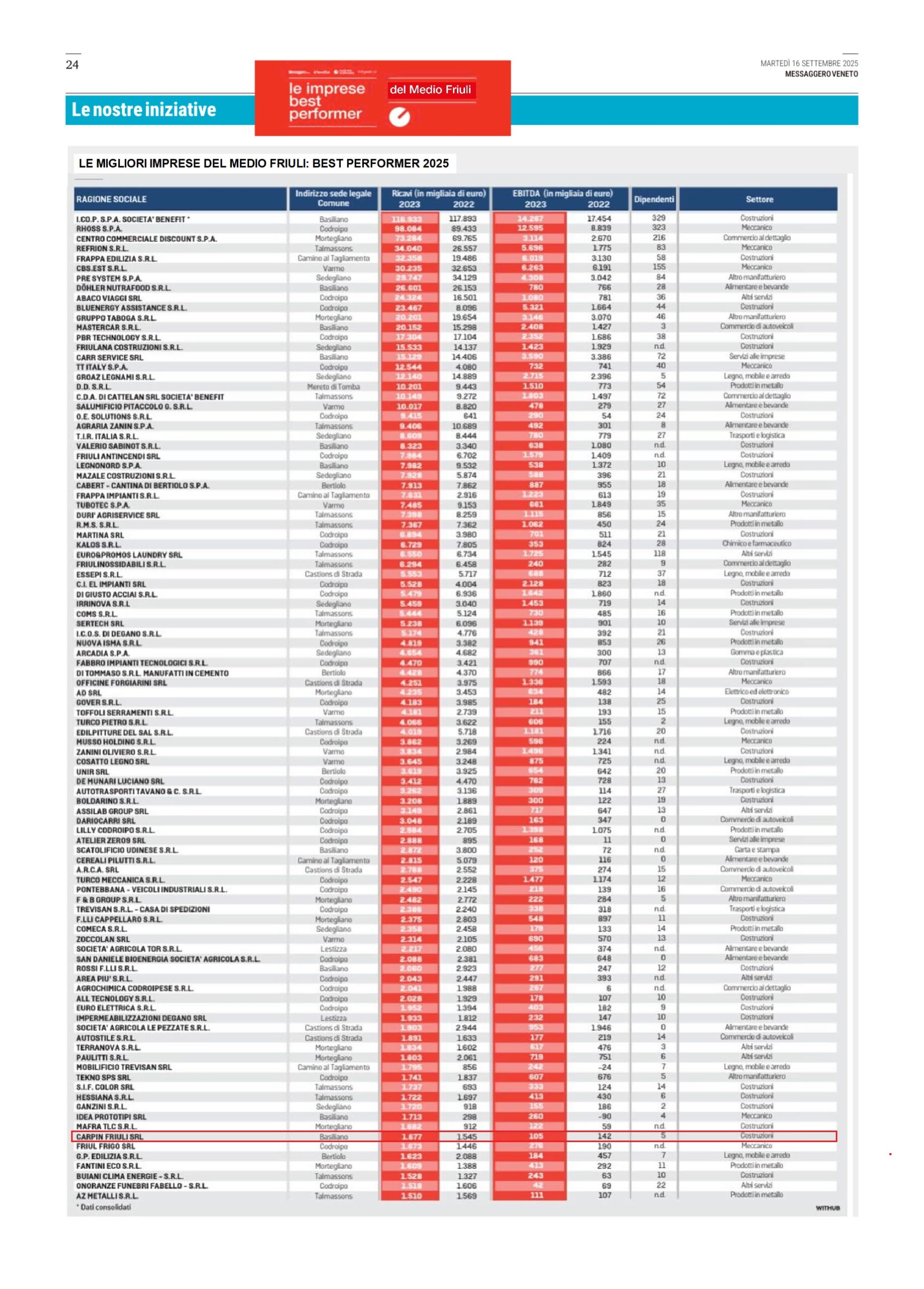 Carpin Friuli è tra le aziende premiate tra le 100 Migliori Imprese Del Medio Friuli per i suoi risultati e il contributo al tessuto economico locale. Nell’ambito dell’evento Best Performer 2025, iniziativa promossa dal Messaggero Veneto, Nord Est Multimedia Spa e ItalyPost.